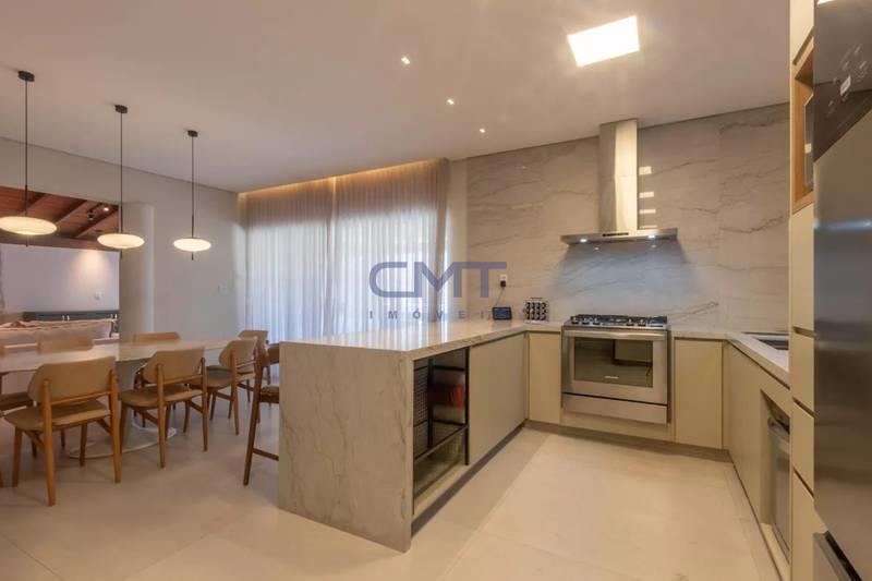 Sala de jantar integrada à cozinha, que conta com marcenaria nova, planejada sob medida, e piso em porcelanato.