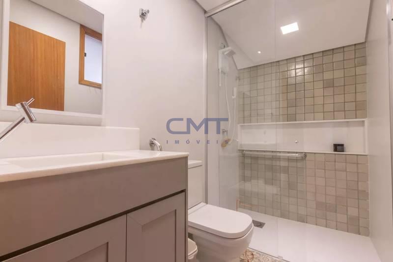 Banheiro social com excelente acabamento em porcelanato, armário, espelho e box em blindex.