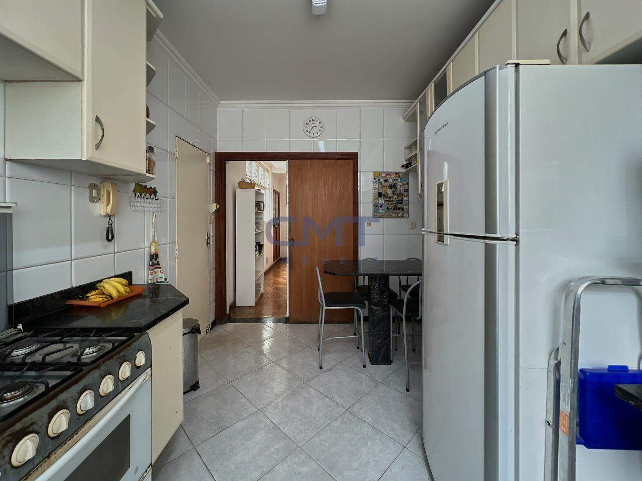 Cozinha ampla com armários planejados, bancadas em granito, piso em cerâmica e acesso à área de serviço.