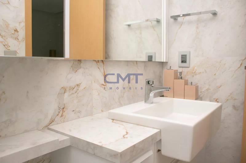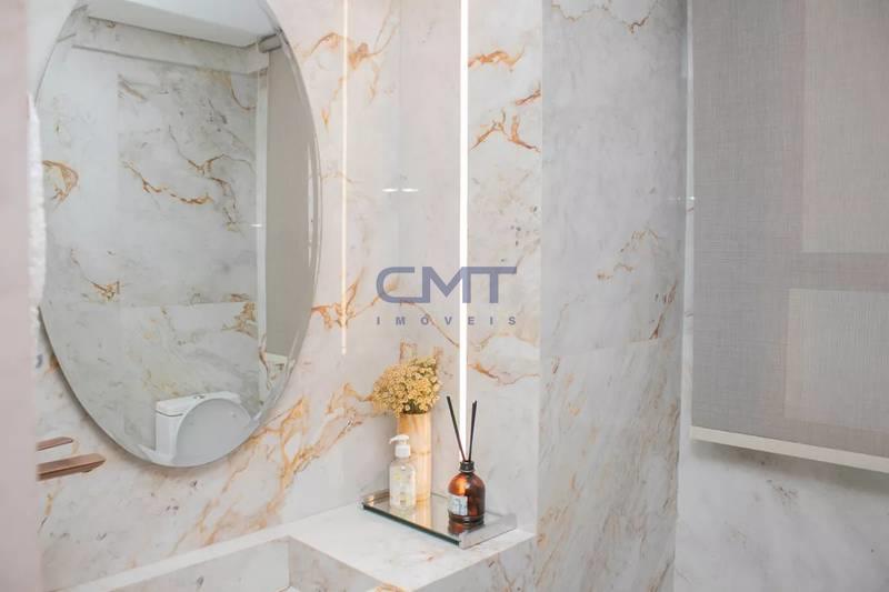 Lavabo com espelho, bancada e piso em porcelanato italiano