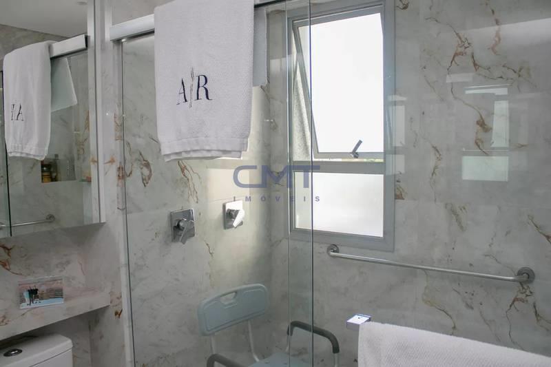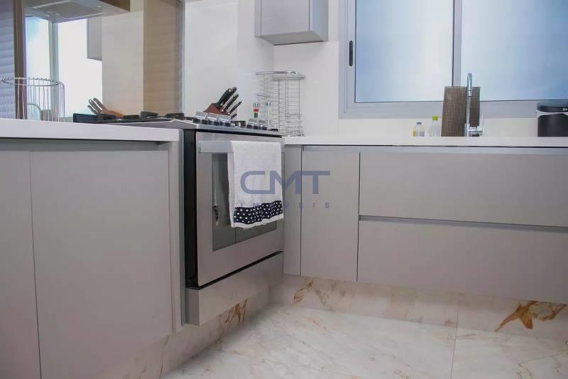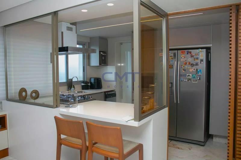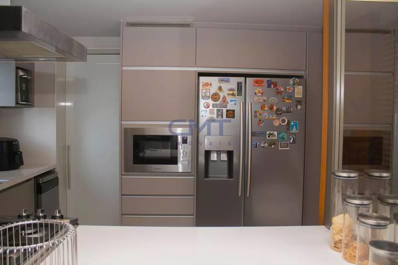 Cozinha ampla com bancada americana, passa-prato e marcenaria da Cinex, persianas automatizadas e piso em porcelanato italiano.