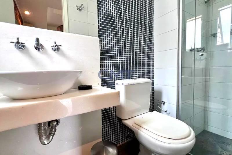 Banheiro social com bancada em granito, armários, espelho e box em blindex.