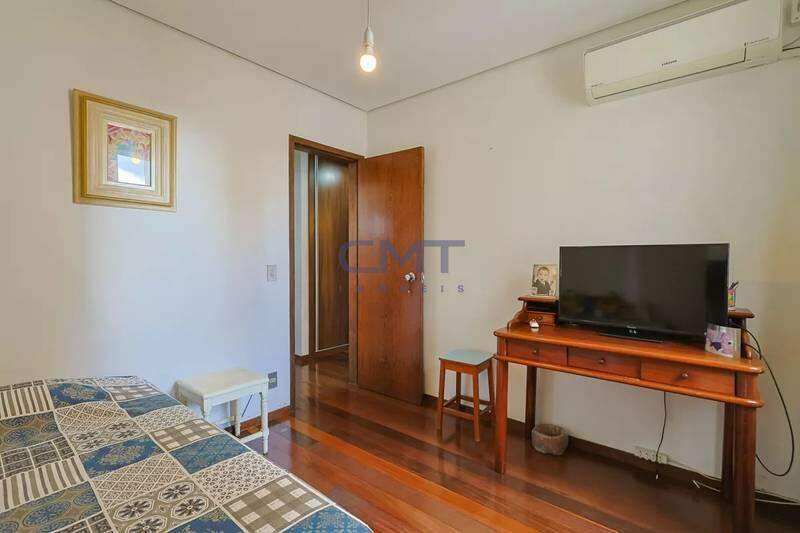 3 quartos espaçosos com armários planejados, ar-condicionado e piso em tábua corrida, sendo 1 suíte.