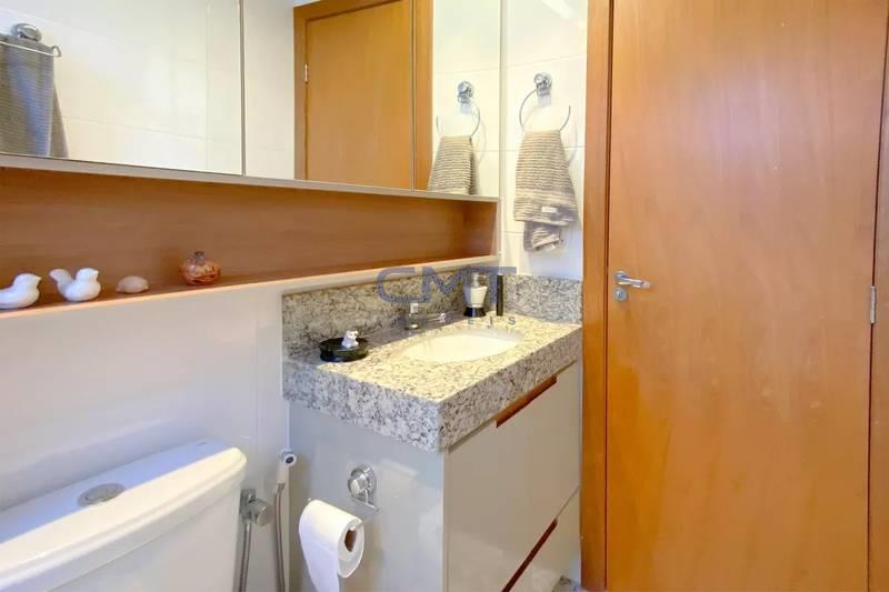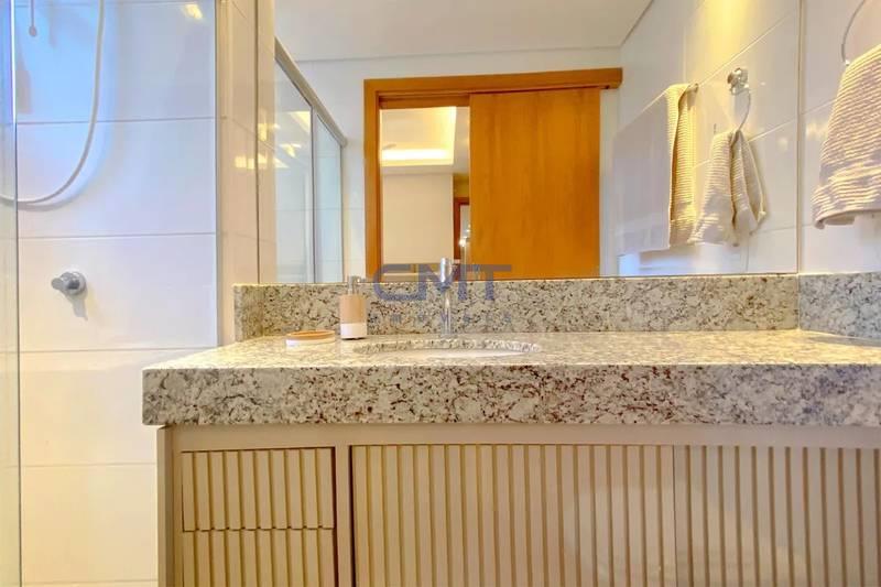 Banheiros (social e suíte) com piso e bancadas em granito, box em vidro temperado (blindex), armários, espelhos e iluminação planejada.