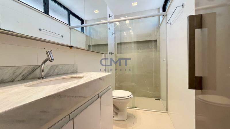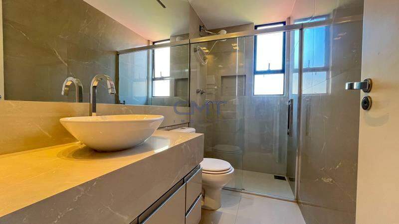 Banheiros com revestimento e piso em porcelanato, espelhos e armários planejados