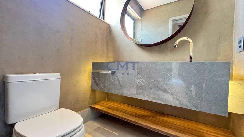 Sala ampla com painel decorativo e lavabo