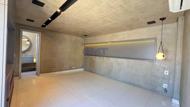 Sala para dois ambientes em porcelanato, com armários planejados, painel espelhado Cinex e televisão embutida, teto rebaixado