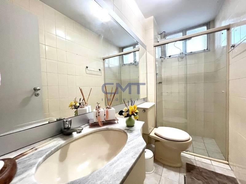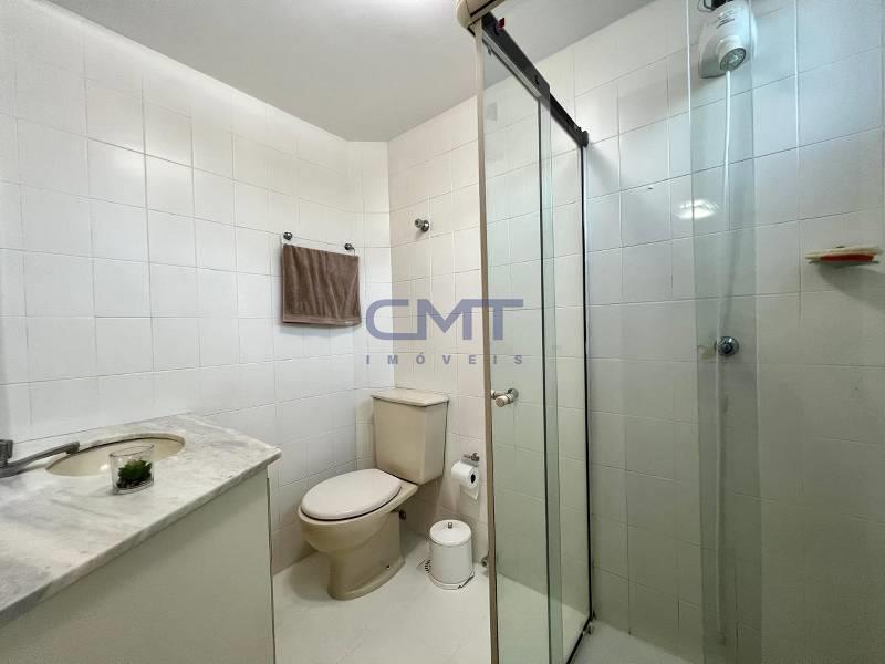 Banheiros (social e suíte) com excelente acabamento, box em blindex e bancada em mármore.