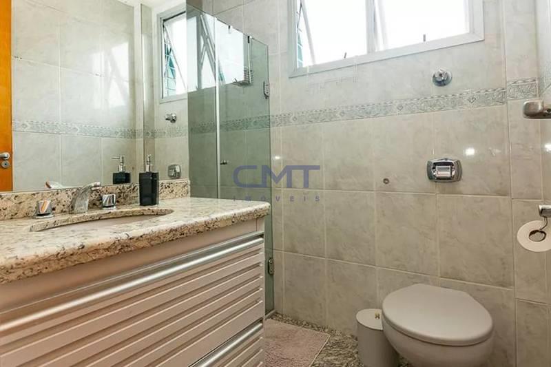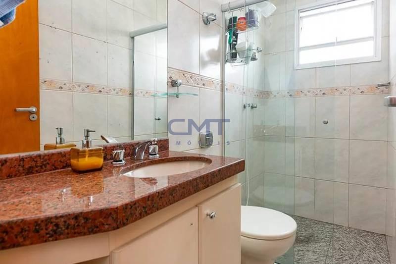 Banheiro social com espelho, bancada em granito, armários e box em blindex