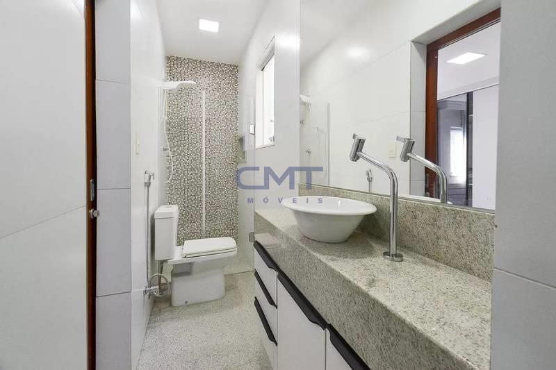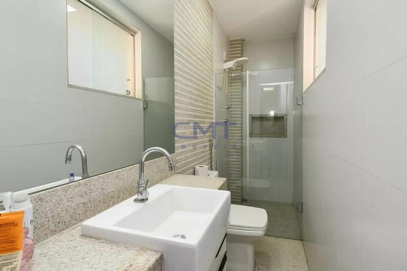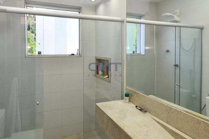 Banheiros (social e suíte) com excelente acabamento, armários, espelhos e box em blindex.