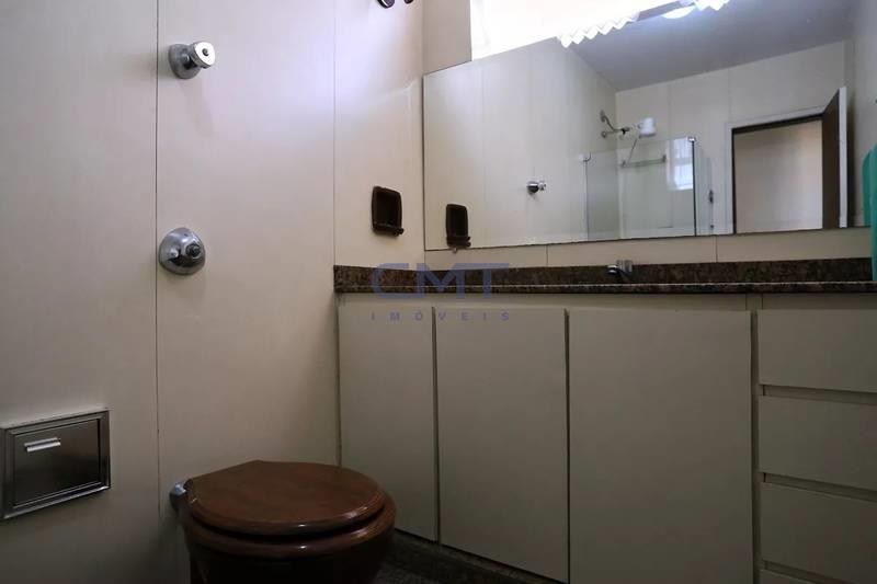 Banheiros (social e suíte) com armários planejados, espelho e box em blindex.
