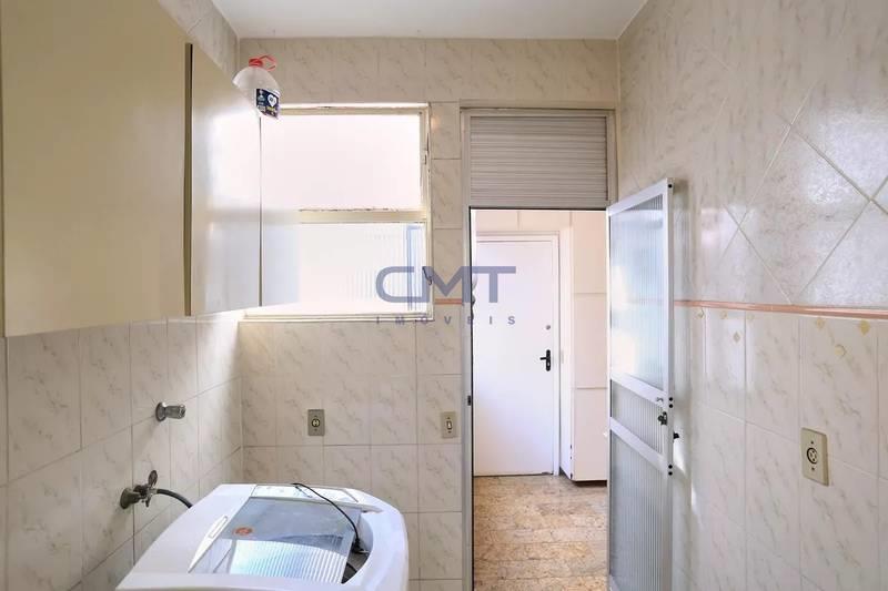 Ampla área de serviço individual com armários e banheiro de apoio.