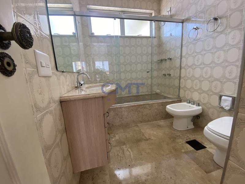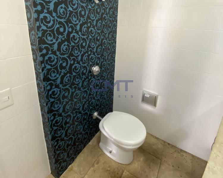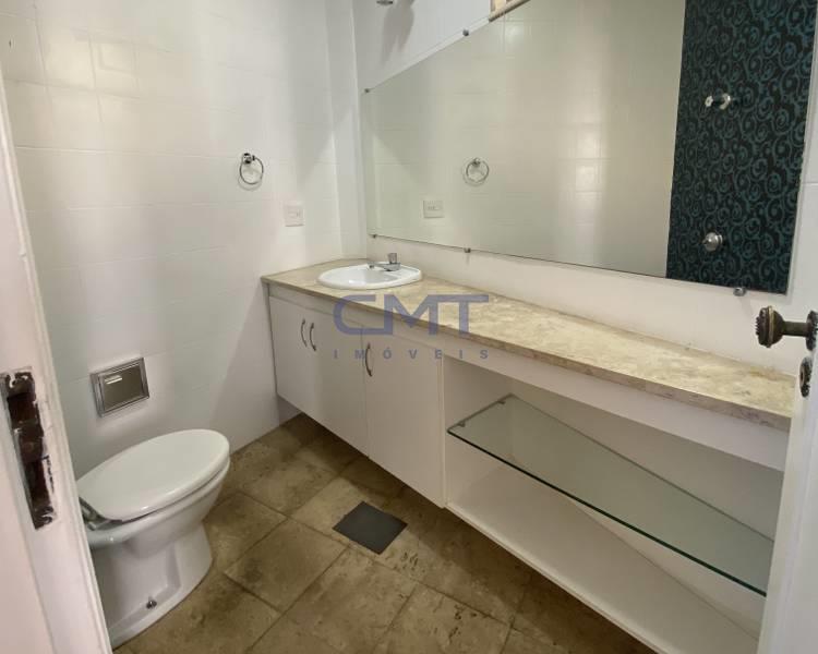 Banheiro social com bancada em granito, armários, espelho e box em blindex