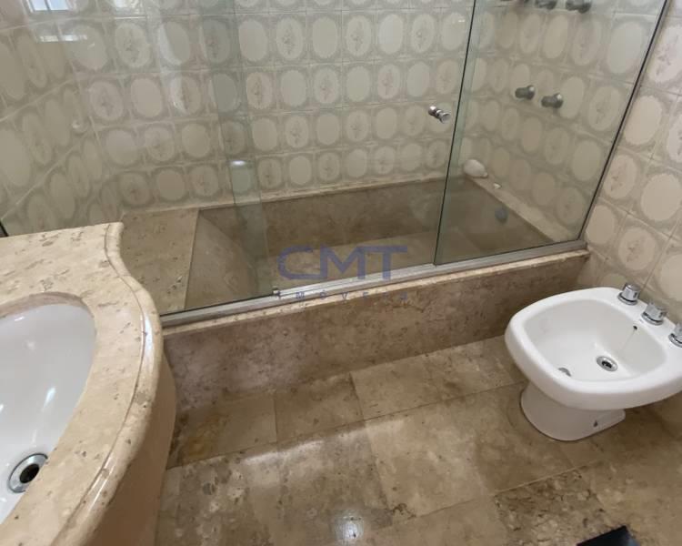 Banheiro social com bancada em mármore, espelho, armários e box em blindex