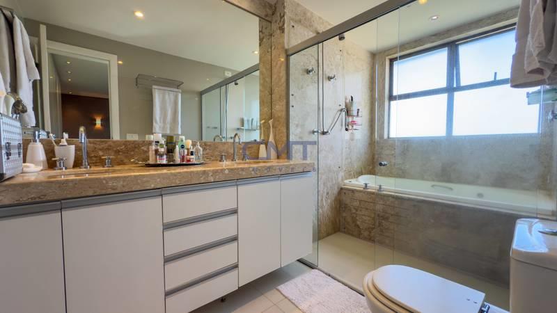 • Banheiros das suítes com bancadas em mármore branco, armários, espelhos e box em blindex.