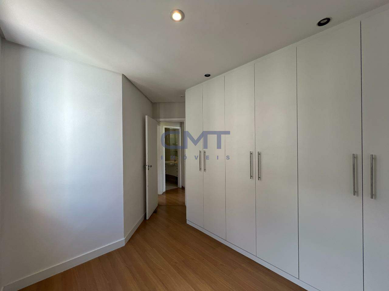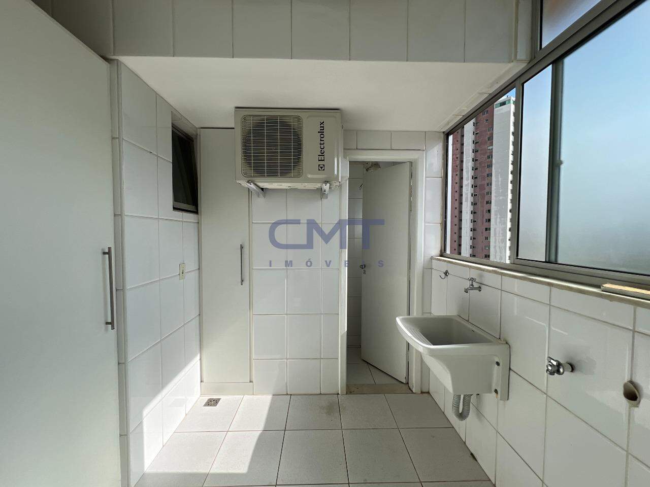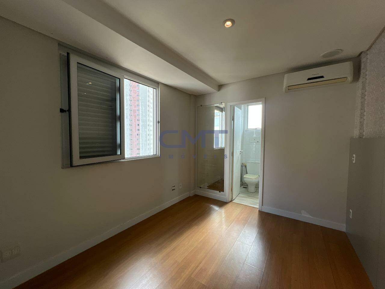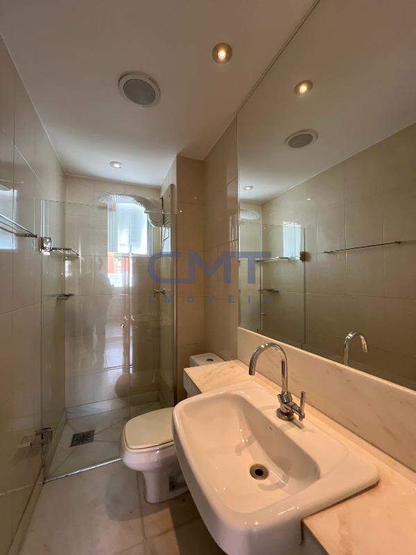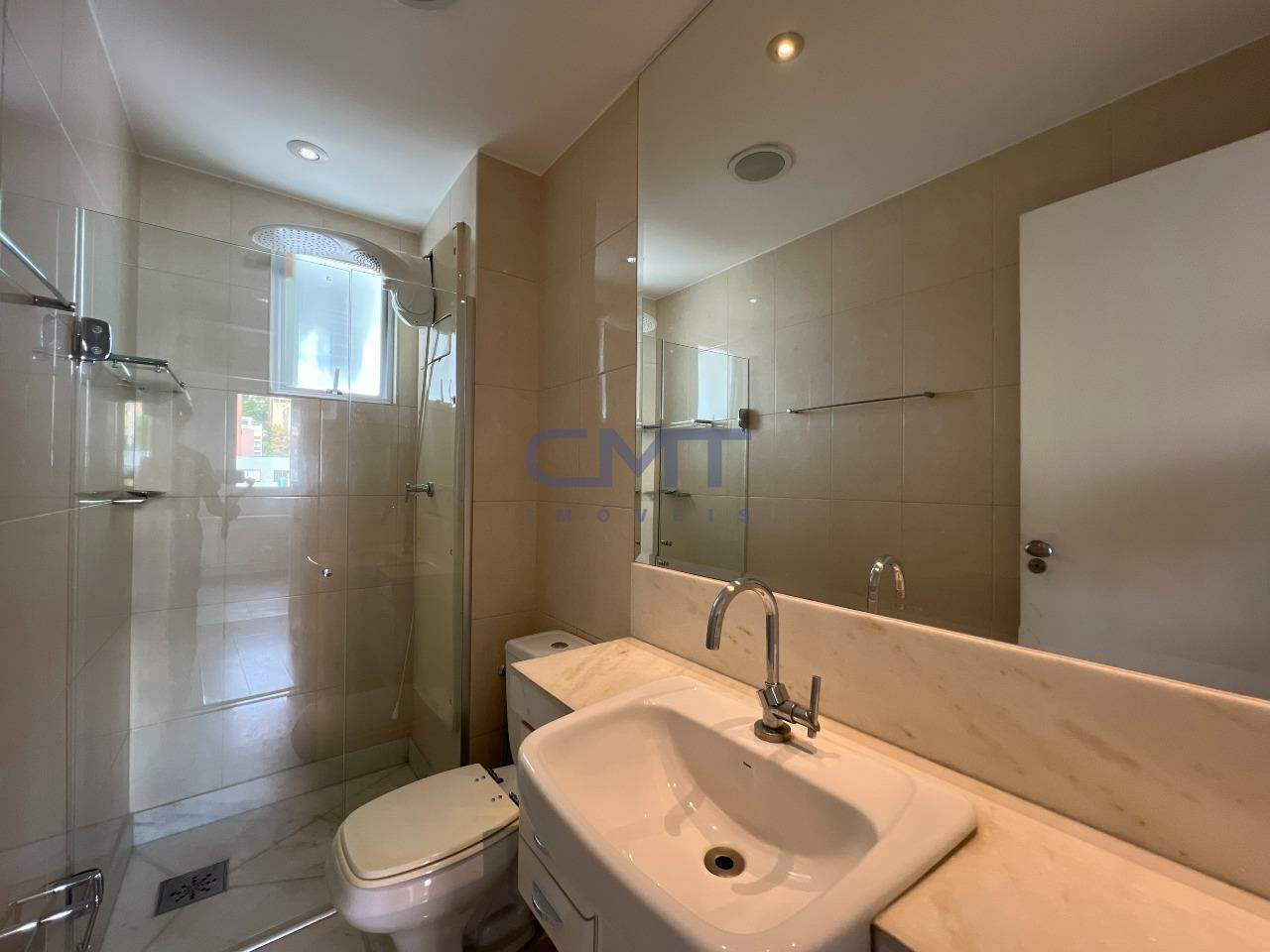 São 3 quartos, sendo um suíte com closet e ar-condicionado; banheiro com piso e bancada em mármore, armário e box blindex.
