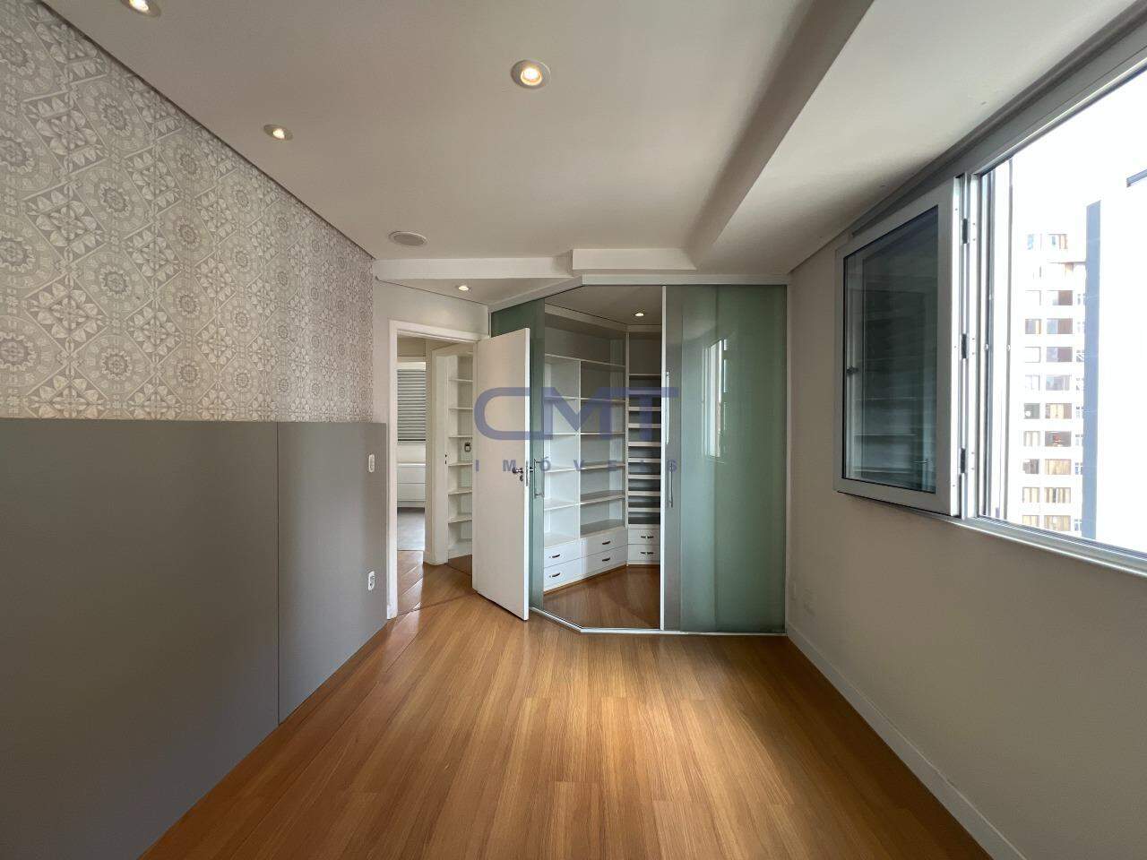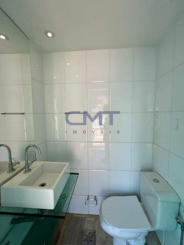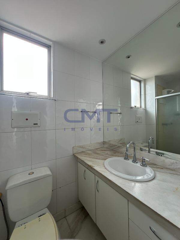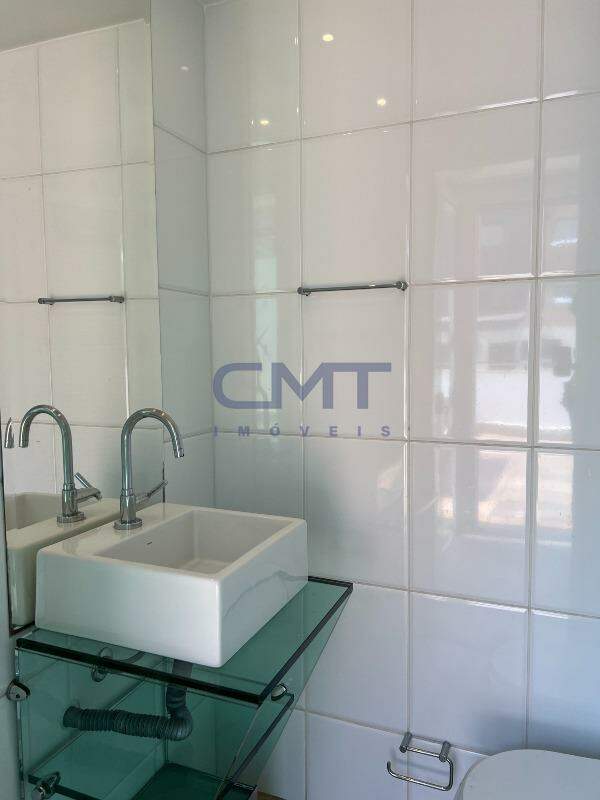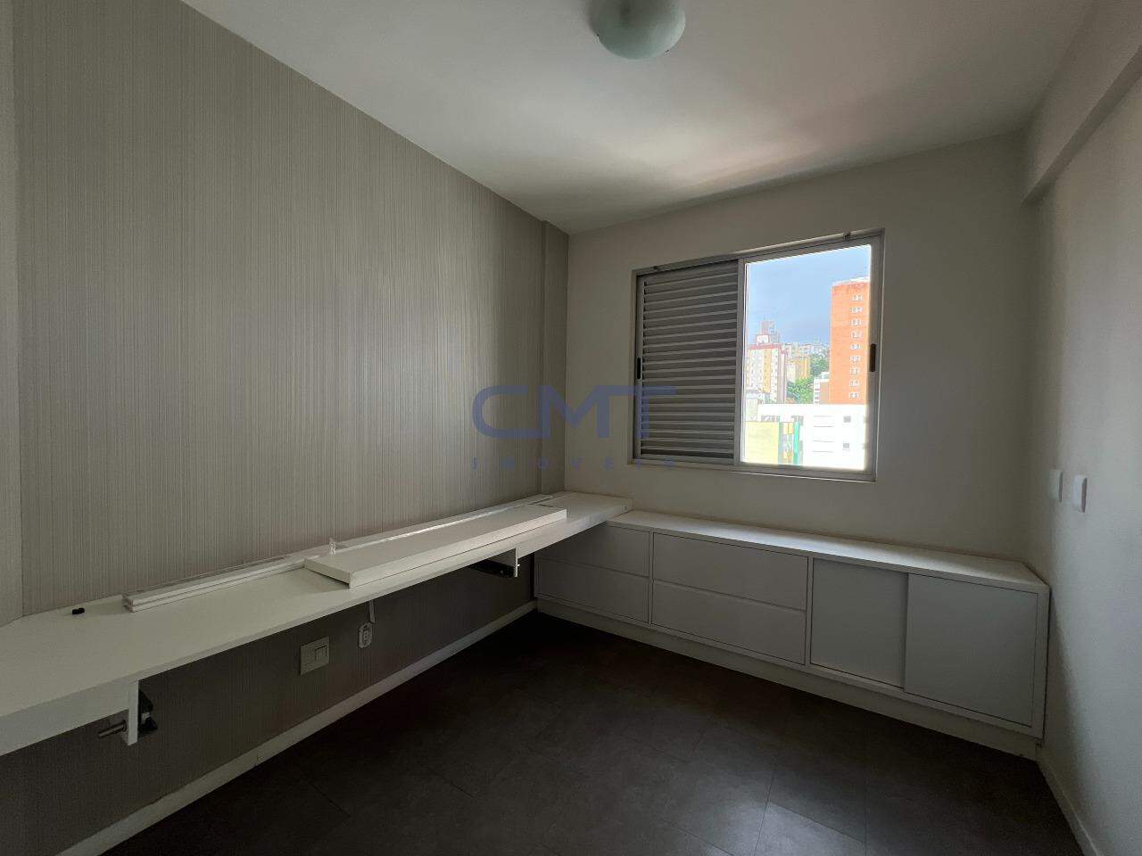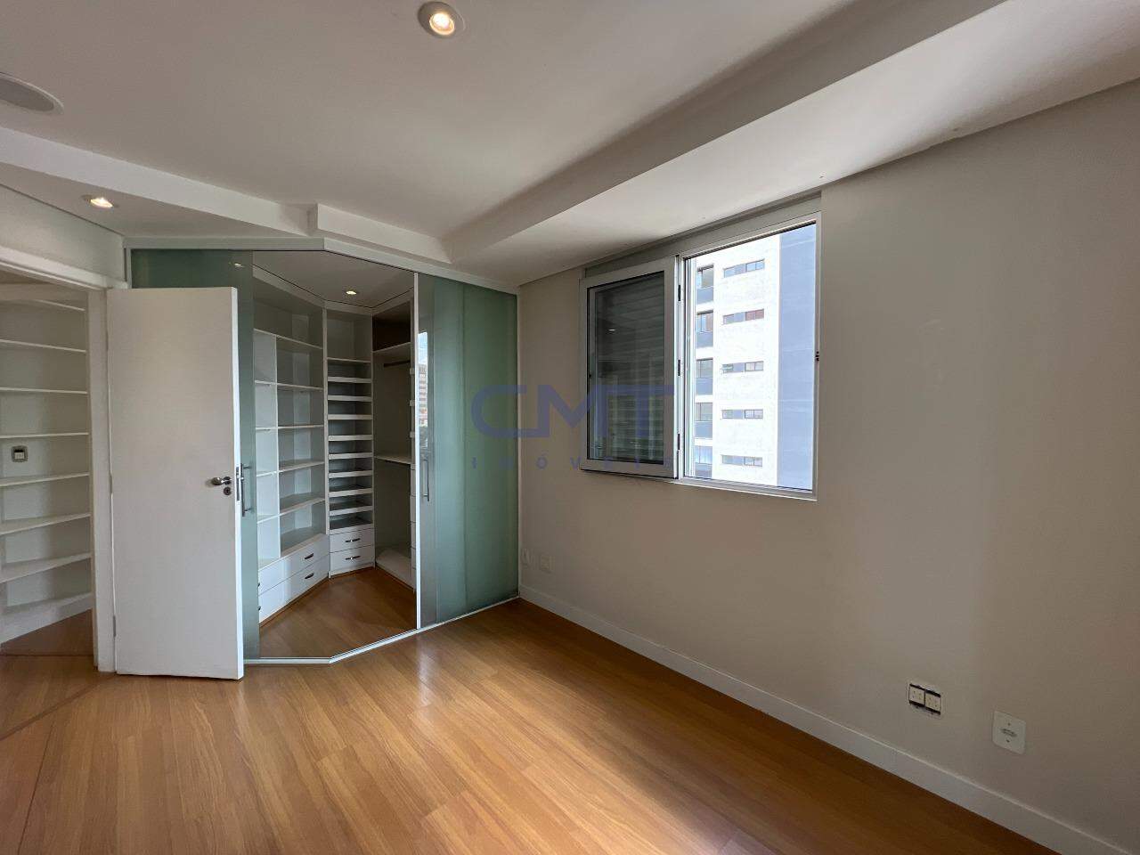 São 3 quartos, sendo um suíte com closet e ar-condicionado; banheiro com piso e bancada em mármore, armário e box blindex.