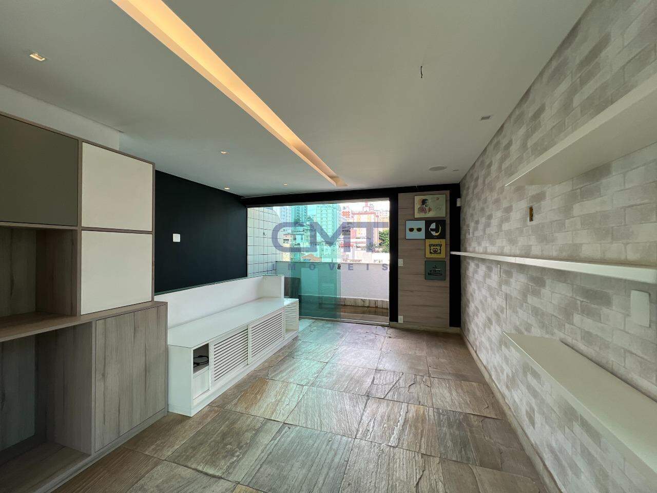 Sala ampla, com piso em pedra São Tomé e rebaixamento em gesso e armários em excelente marcenaria.