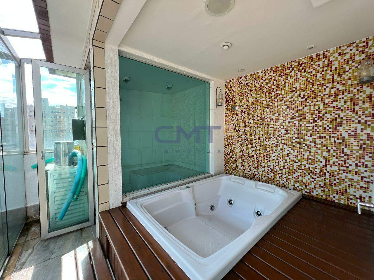 Piscina com deck em madeira, jacuzzi, sauna e área descoberta com vista definitiva.