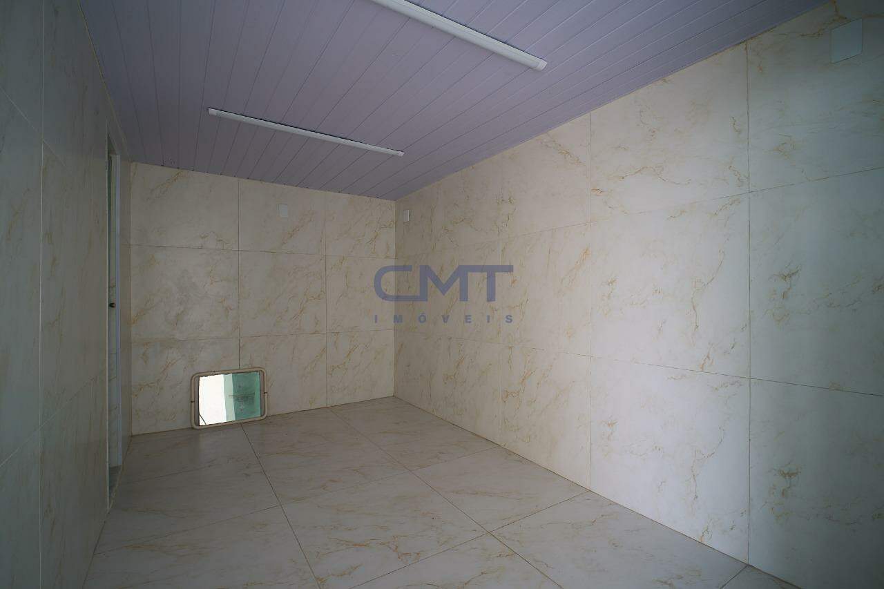 Cozinha com piso em porcelanato e bancadas em granito. Acesso independente à área de serviço, com quarto e banho de serviço.