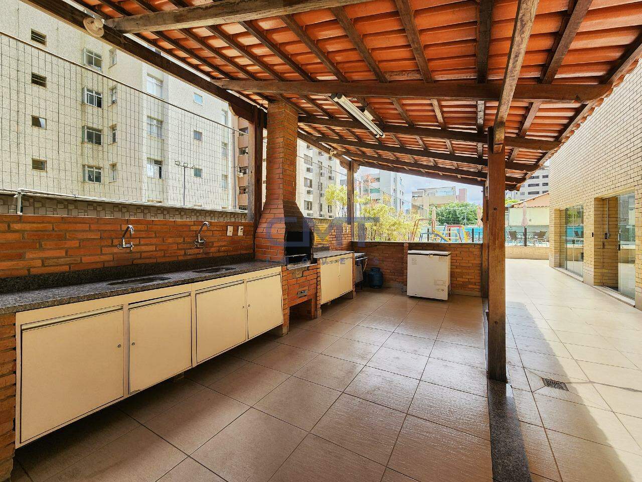 Ampla sala, com piso em porcelanato e amplo acesso à área externa com fechamento em vidro, proporcionando excelente luminosidade no ambiente. Conta também com ambiente multiuso coberto.