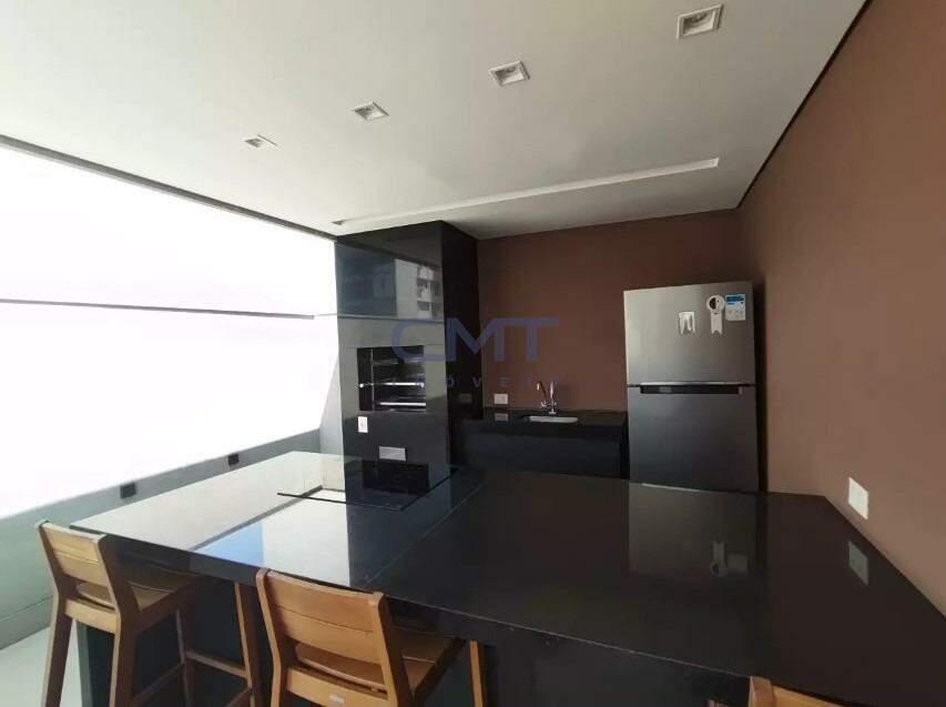 Ambiente amplo com iluminação planejada, piso vinílico e janelas amplas, proporcionando melhor ventilação e luminosidade natural no interior do ambiente. Conta com bancada em granito com armários planejados para a área da cozinha e guarda roupas planejado para ambiente da cama.