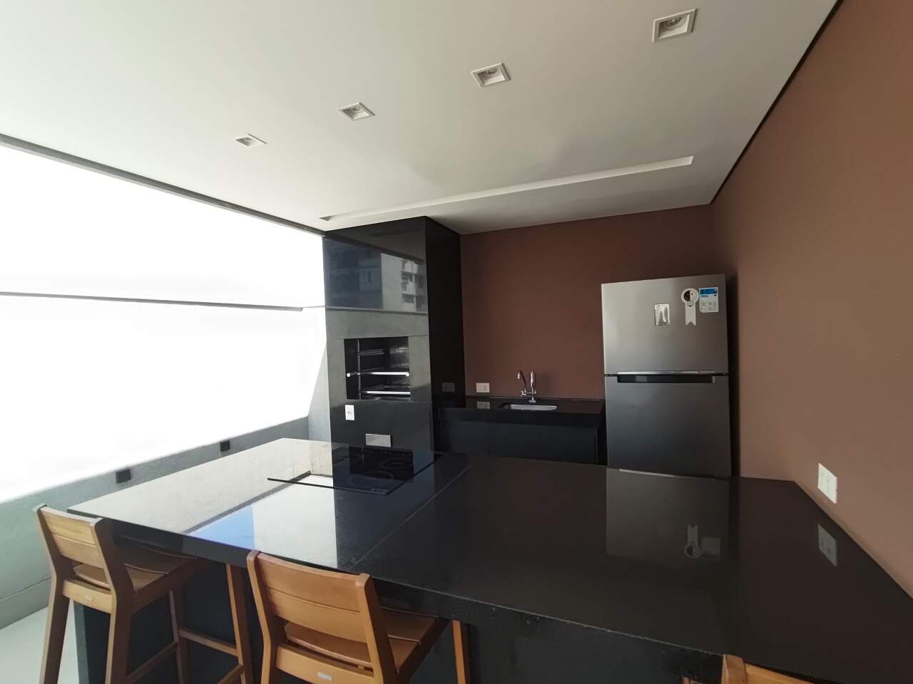 Ambiente amplo com iluminação planejada, piso vinílico, janelas amplas e acesso à área externa em blindex, proporcionando melhor ventilação e luminosidade natural no interior do ambiente. Conta com bancada em granito com armários planejados para a área da cozinha e guarda roupas planejado para ambiente da cama.
